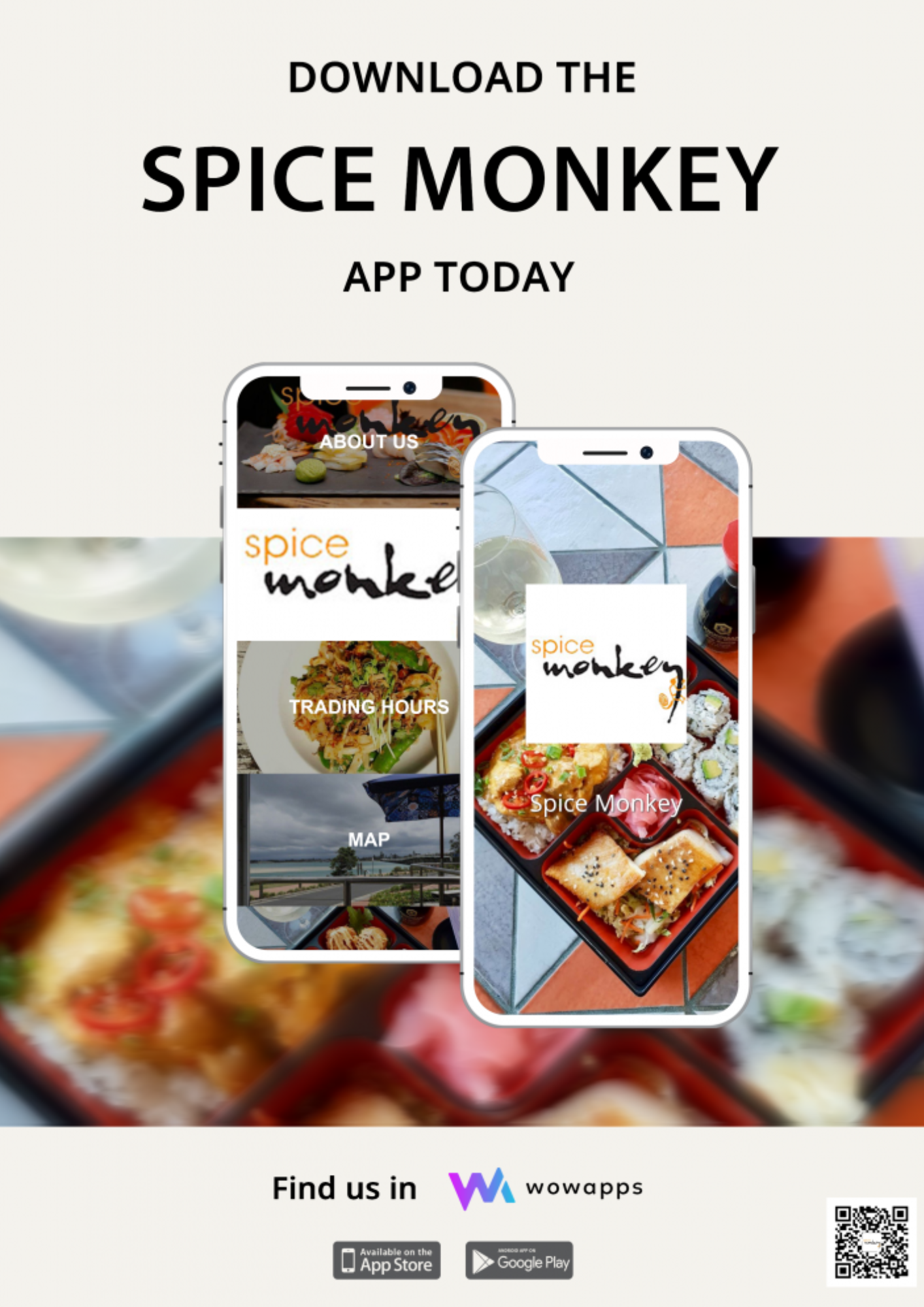 Get your Spice Monkey favourites via online ordering. To download our app: 1. Go to the App Store or Google Play Store. Search Wowapps & download 3. Search Spice Monkey & away you go!⠀